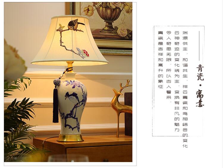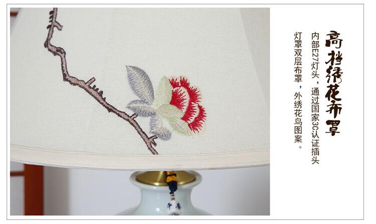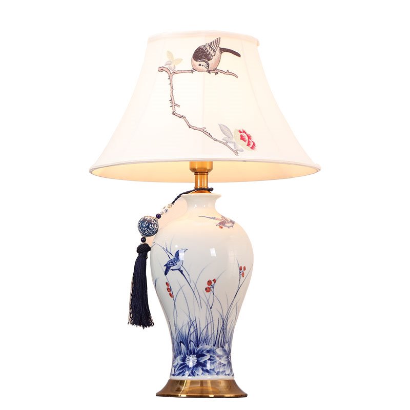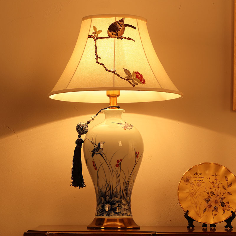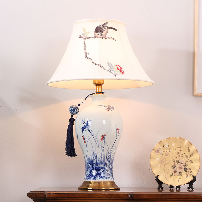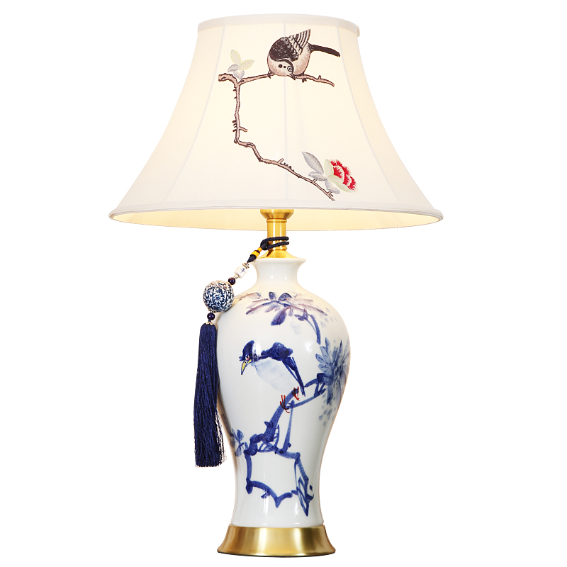 T3132A小鸟刺绣灯罩手绘青花瓷陶瓷台灯
